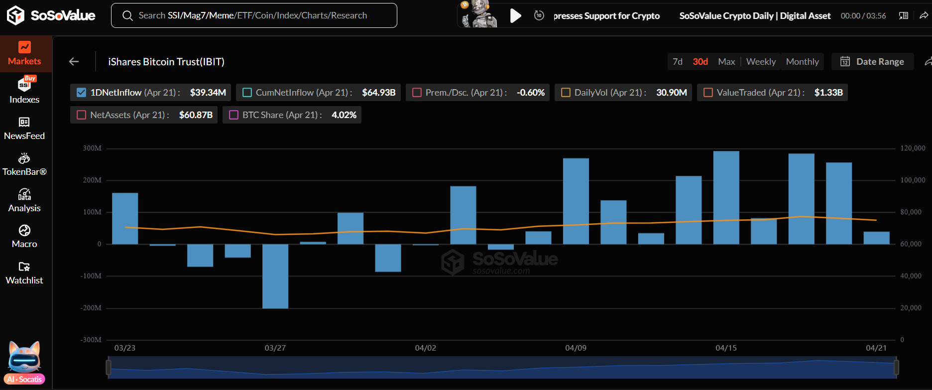 IBIT is BlackRock’s Bitcoin exchange-traded fund. Between April 8 and April 20, IBIT has registered a net cash inflow of approximately $1.609 billion. The highest single-day inflow for IBIT was recorded on April 15 at $291.86 million, which is approximately equivalent to 3,891 BTC. The smallest daily cash inflow was $34.70 million on April 13, which is equivalent to 473 BTC.